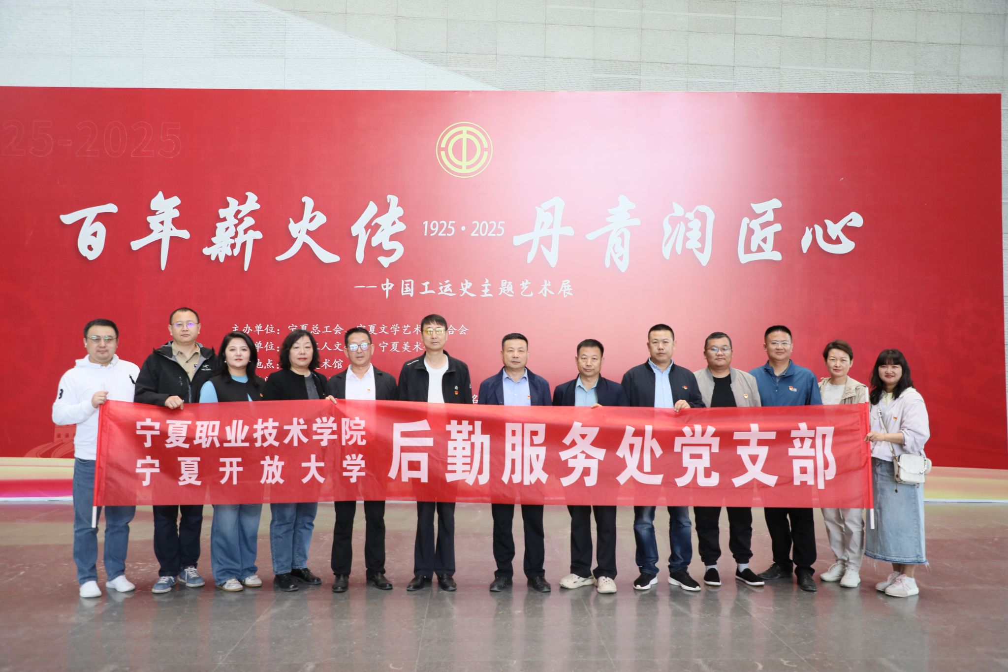 为深入学习贯彻习近平新时代中国特色社会主义思想,进一步弘扬劳模精神、劳动精神、工匠精神,5月14日上午,后勤服务处党支部积极响应学校号召,与学校工会、党政办公室等共11个基层党支部一同前往宁夏美术馆,参加了“百年薪火传 丹青润匠心”中国工运史主题艺术展主题党日活动。